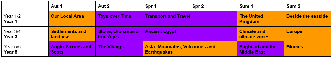 The Key Stage 1 and Key Stage 2 curriculum builds on the National Curriculum framework for Early Years Foundation Stage, particularly the area of learning and development ‘Understanding the World’. Throughout their time at Diss Primary Academy, pupils will build their substantive geographical knowledge alongside the disciplinary concepts. These have been interwoven into the half termly units of work, enabling children to build progressive knowledge and skills and reinforce and apply these across a number of different contexts. Each unit of work has an enquiry question at the heart of it. This provides a focus for each unit, with lessons sequenced to provide pupils with the knowledge and skills needed to create a successful response to the question at the end of the unit. The children are taught in mixed-age classes and the curriculum is taught in a 2-year rolling cycle.